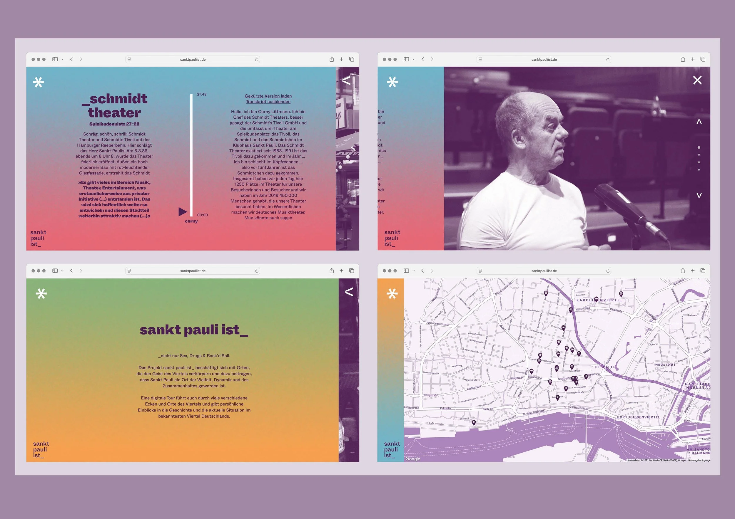 sankt pauli ist_ entstand als digitales Ausstellungsprojekt verbunden mit dem öffentlichen Raum des wohl bekanntesten Hamburger Stadtteils – Sankt Pauli. Im Mittelpunkt der Webseite steht nicht nur die touristisch geprägte Reeperbahn, sondern vielmehr das alltägliche Leben, das von einer Vielzahl an Orten, Menschen und Geschichten geprägt ist.