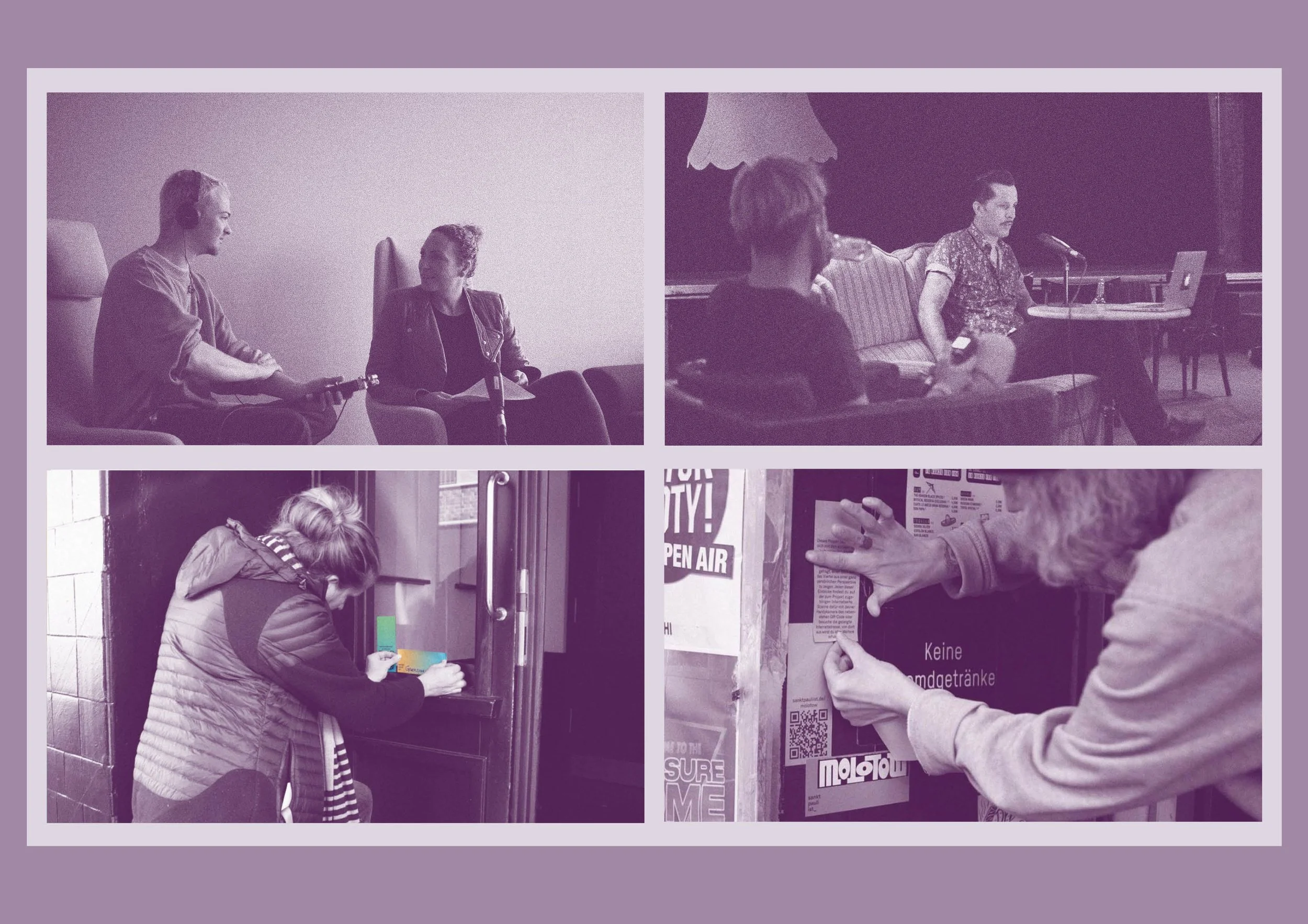 Der Zugang zur Webseite ist bewusst im öffentlichen Raum verortet – auf Plakatflächen, an Hausfassaden, in Schaufenstern oder als temporäre Installationen im Straßenbild. So tritt sie in direkten Dialog mit der Nachbarschaft und den Passant*innen. Die Grenze zwischen Ausstellungsprojekt und Stadtgespräch verschwimmt: Das Viertel selbst wird Teil des Ausstellungsraumes, und die Bewohnenden sind zugleich Protagonist*innen und Publikum.